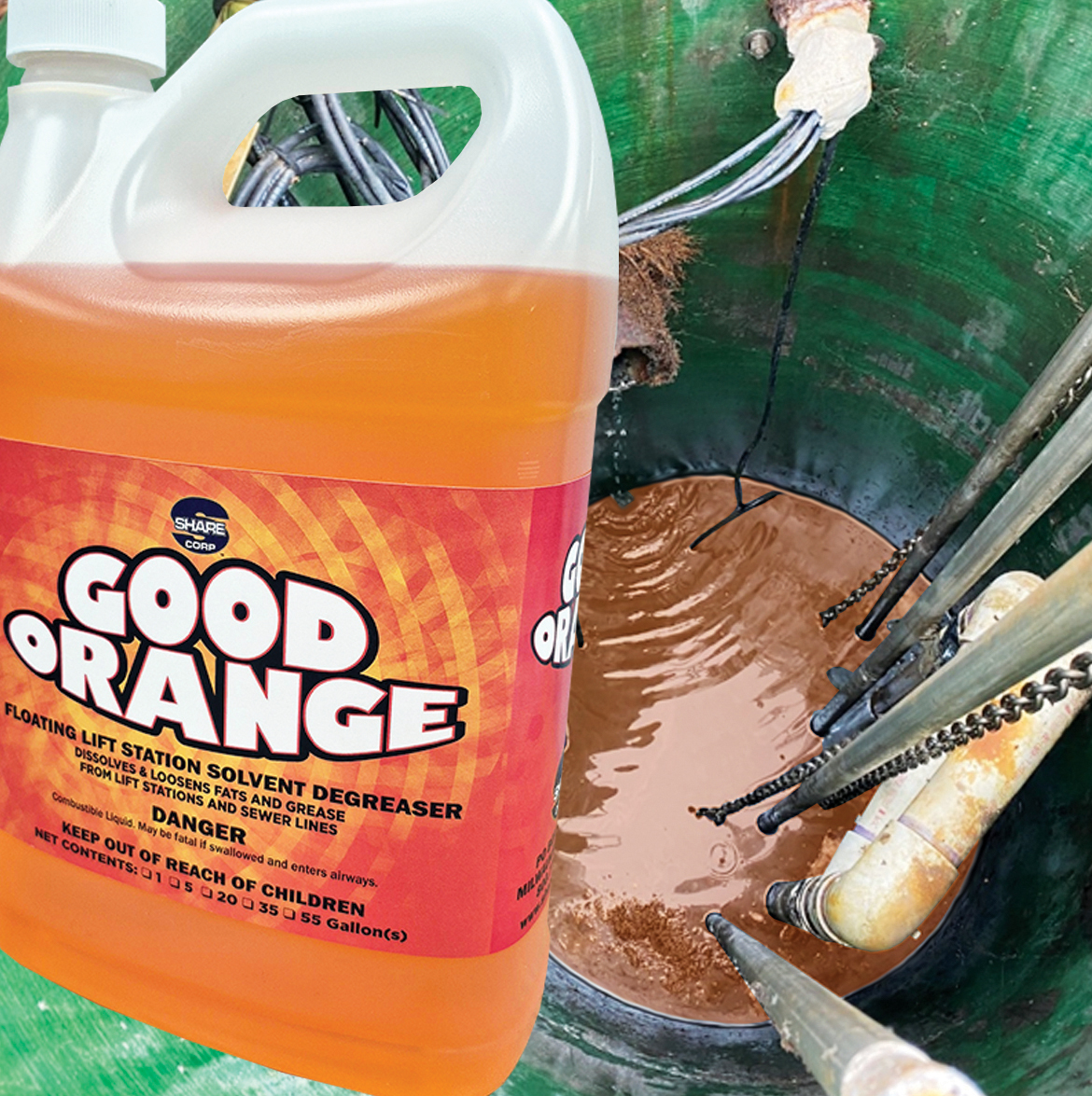 GOOD ORANGE Floating Lift Station Solvent Degreaser is a pleasantly scented solvent degreaser specially formulated to dissolve grease and fats in sewer lines, lift stations and grease traps. This product floats on the surface of the water to strip away fat and grease accumulations as water levels naturally rise and fall. Built-in emulsifiers entrap the debris and dissolved greases in the solvent to aid in complete removal. A built-in, color level indicator allows the operator to determine product level by visual inspection.