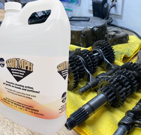 TRIUMPH Multi-Purpose Cleaner and Degreaser is gushing with pure cleaning power! It is strong and can tackle the toughest cleaning & degreasing jobs like removing: Grease, oil, tar, wax, ink, sap, resin, adhesives, paint, bugs, and more! They work great on steel, aluminum, wood, glass, rubber, chrome, fiberglass, and all water-safe surfaces.